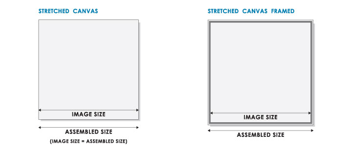 When purchasing an artwork from The March Collective the dimensions given are those for the size of the artwork image itself. Once the artwork is framed, the finished size will in most cases be larger. It is important to view the Assembled Size before making your purchase to ensure the artwork fits onto your chosen wall, accommodating the frame around the edge. The diagrams below demonstrate the difference between Image Size and Assembled Size for each of the Framing Options.
